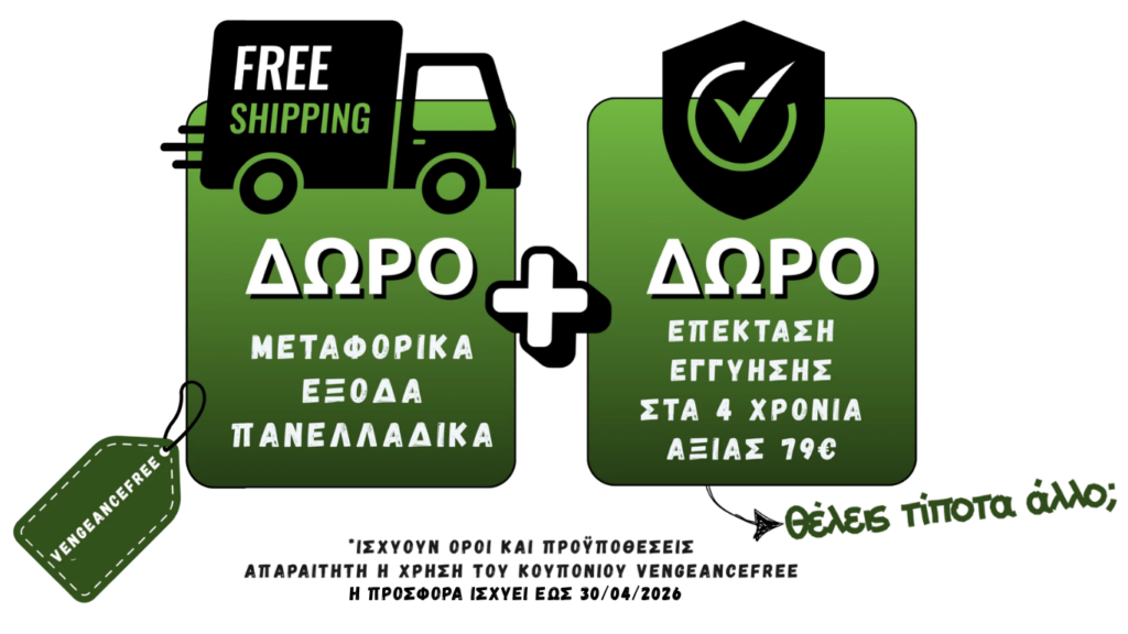 Δωρεάν μεταφορικά και δώρο επέκταση εγγύησης στα 4 χρόνια αξίας 79€ χρησιμοποιώντας στο ταμέιο το κουπόνι VENGEANCEFREE