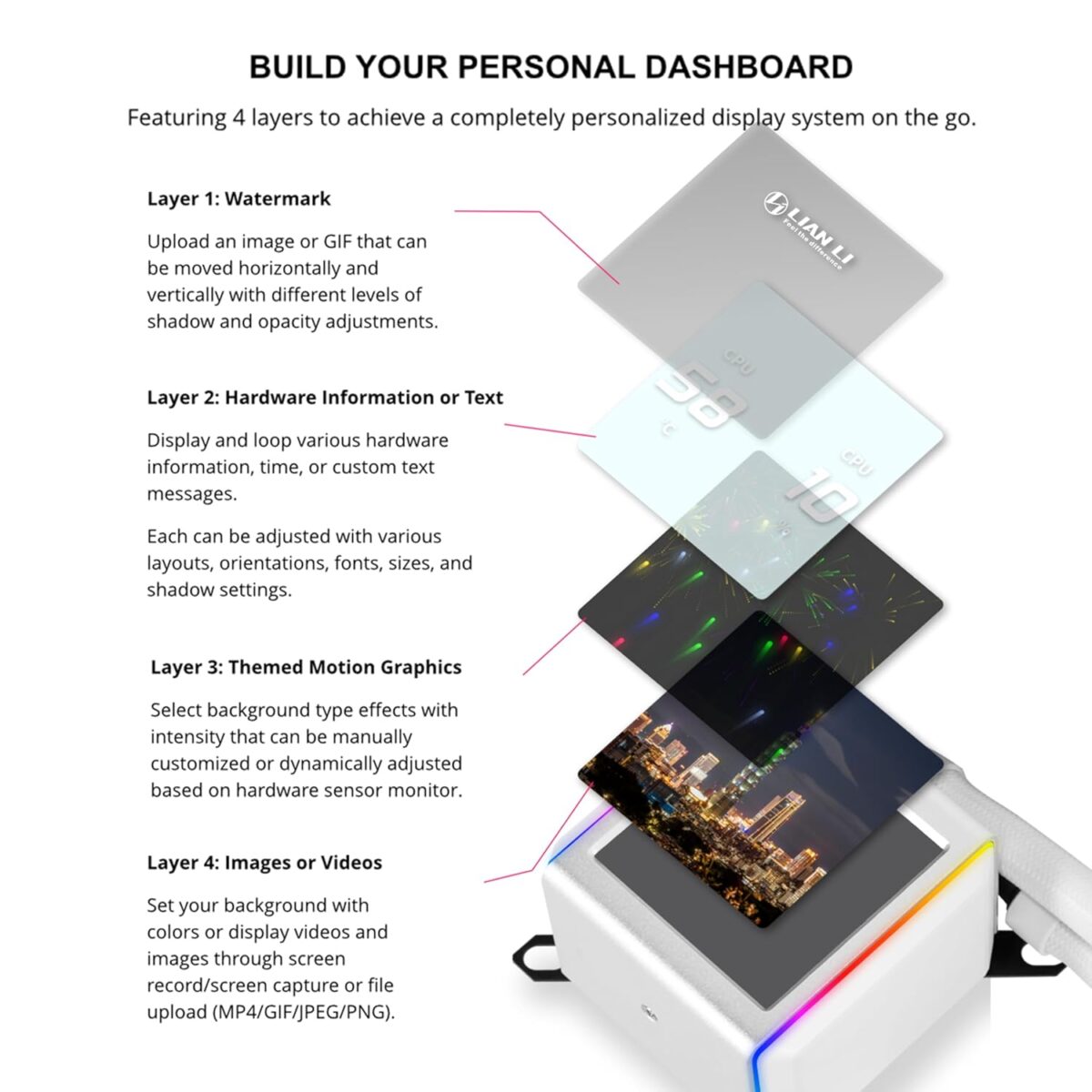 Το Lian Li Galahad II LCD AIO είναι το πρώτο Cooler της Lian Li που διαθέτει οθόνη IPS 2,88". Αυτή η οθόνη 480 x 480 μπορεί να χρησιμοποιηθεί για μια μεγάλη ποικιλία εργασιών. Αυτό περιλαμβάνει την εμφάνιση σημαντικών πληροφοριών συστήματος, όπως θερμοκρασίες CPU ή FPS στο παιχνίδι. Παράλληλα, μπορείτε να αξιοποιήσετε την οθόνη για την ενίσχυση της αισθητικής του υπολογιστή παιχνιδιών σας. Για την απόλυτη εξατομικευμένη πινελιά, αυτή η οθόνη υποστηρίζει αρχεία JPEG, PNG, GIF ή ακόμη και MP4, επιτρέποντάς σας να εμφανίζετε προσαρμοσμένο περιεχόμενο, όπως ένα στιγμιότυπο του αγαπημένου σας παιχνιδιού.